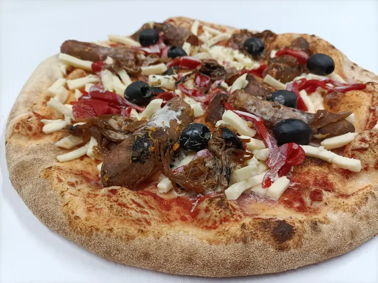 Ingrédients : Merguez (viande origine France), mozzarella fior di latte, oignon cuisiné, poivron piquillo, crème, olives, origan