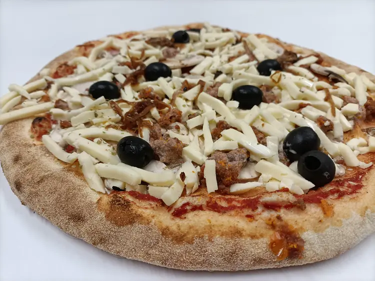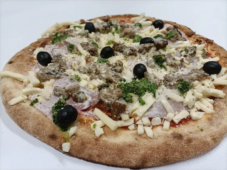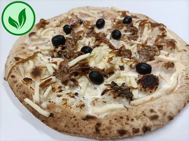 Ingrédients : Champignon, bolo (boeuf origine France), mozzarella fior di latte, oignon cuisiné, crème, olives, origan