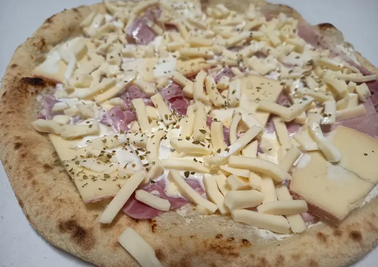 ingrédients : base crème, pomme de terre aillée, saucisse de Morteau "IGP"(porc origine France), mozzarella Fior di latte, morbier au lait cru AOP, crème moutardée, origan
