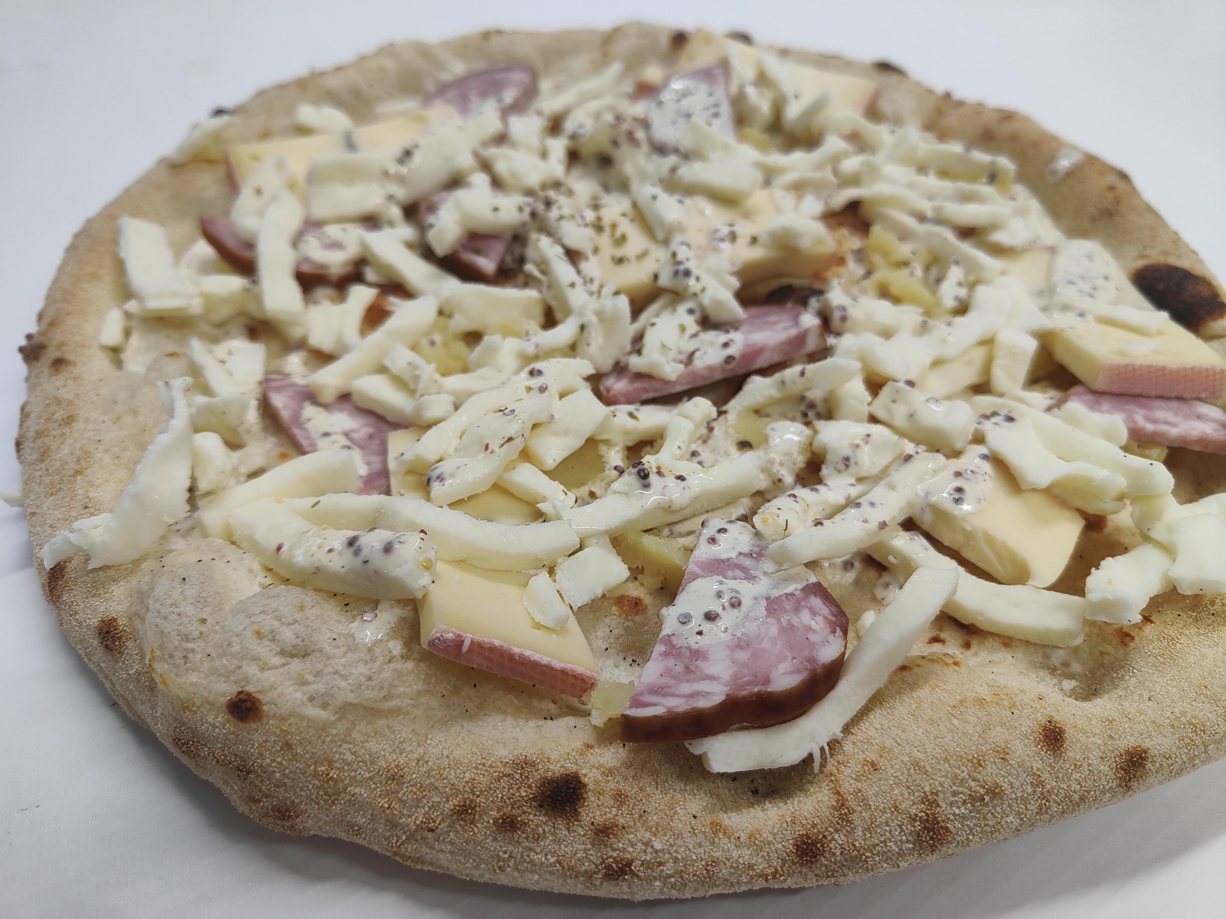 ingrédients : base crème, pomme de terre aillée, saucisse de Morteau "IGP"(porc origine France), mozzarella Fior di latte, morbier au lait cru AOP, crème moutardée, origan